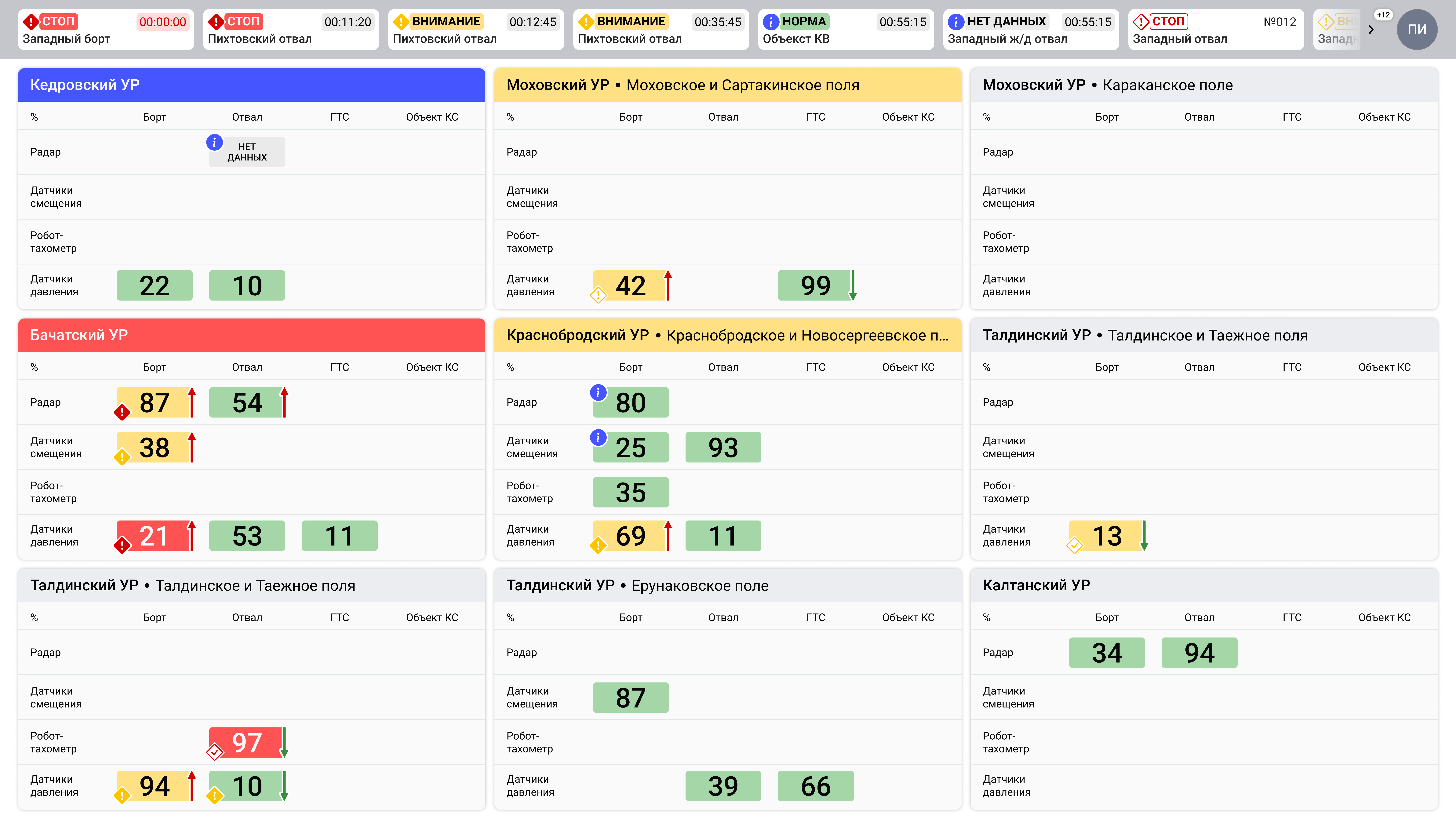 Система КРУ — цифровая платформа мониторинга устойчивости бортов и отвалов на угольных разрезах. Она агрегирует данные с геотехнических датчиков и отображает состояние участков добычи в реальном времени. Продукт используется диспетчерами для контроля отклонений и экстренного реагирования с целью предотвращения аварий и сохранения жизни людей и техники